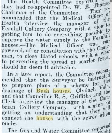 The Health Committee had previously in June 1901 “recommended that the Surveyor be instructed to prepare plans of a scheme for the drainage of Bush houses, Clydach Vale, and that Councillor R.S. Griffiths and the Clerk interview the manager of Cambrian Colliery Company with a view to get an understanding that they will connect the houses with the sewer when made.”