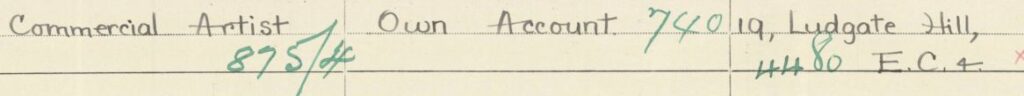 A commercial artist’s job is perhaps equal parts manual and brain work, as illustrated (sorry) by Arthur Hagg, the unexpected lodger with Sydney and Emily Howes in New Cross. His tale is told in the earlier Cutlock piece Illustrating a strong objection to war, but with sight of the actual 1921 form we now can see that he gives a work address in Ludgate Hill, a hub of the publishing industry. Working on his “own account”, how could he afford to be based there? Most likely an arrangement with some business, getting facilities in return for his services.