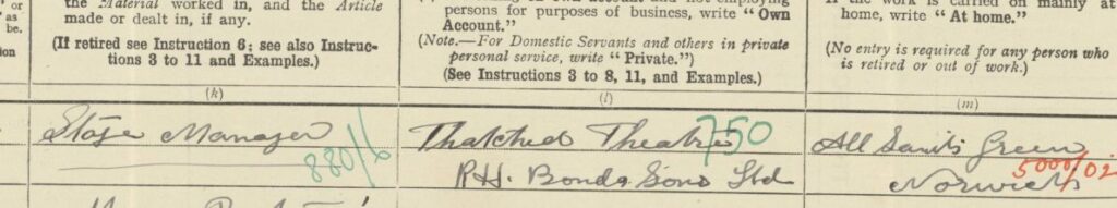 The husband of great aunt Ellen (nee Neal), Henry JV Williams, appears in the 1911 census as a general decorator (and earlier as an upholsterer/paperhanger) – the same line of work as great grandfather Arthur AB Howes. But by 1921 he has become a stage manager at the Thatched Theatre, employer RH Bond & Sons Ltd. This may be a slightly glorified title – at Ellen’s death the following year he gives his occupation as ‘stage carpenter (picture house)’. This is all in Norwich.
