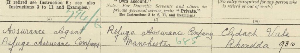 He managed to educate himself through night school nevertheless, becoming an insurance agent, from about 1926, then inspector and branch manager. But it turns out he had a role model, and likely assistance, in that pursuit – brother William. William’s 1921 census entry, with his wife and two children, shows him earning a crust as a local Agent with ‘Refuge Assurance Company‘ (life insurance and pensions provider) {2}.